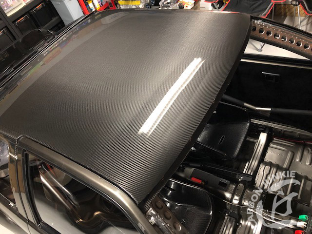 低重心による操縦性向上。構成にUDプリプレグを使用することによりハリをもたせています。例:2dr純正重量約9.2kgなので7.4kgの軽量化を実現します。