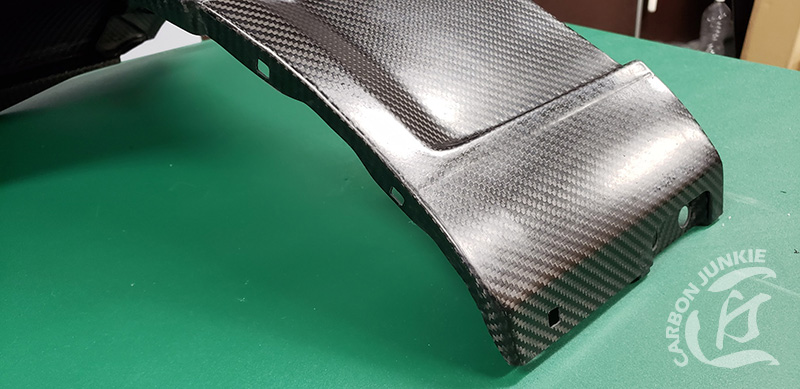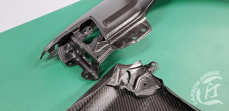 純正スチール製約3.0kgに対し大幅な軽量化となります。20mmワイドなので使用するホイールサイズの選択肢も広がります。取付部分の各ブラケット(3ヵ所)もドライカーボン製と拘った造りとなります。20mmワイドアーチ部以外は純正形状を再現しております。